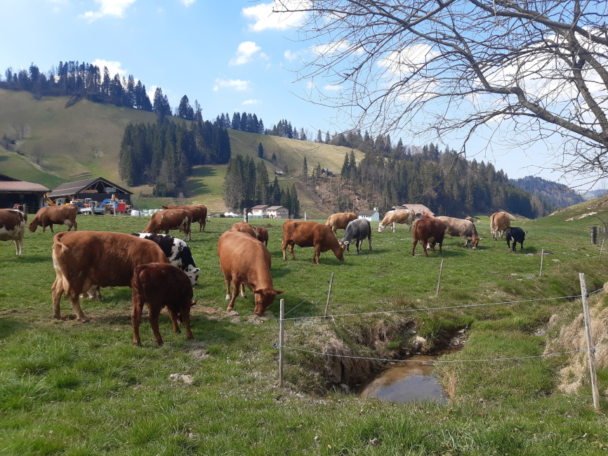Wir haben auf Mutterkühe umgestellt und produzieren Mastkälber nach IP-Suisse Standard. Ausserdem haben wir den vorhandenen Anbindestall zu einem Laufstall umgebaut.